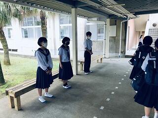 保体委員会は日々の換気や石けん液の補充に加え、手洗い場の密を避けるために待機ラインを設けたり、良く触る部分に目印のシールを貼ってくれたりしました。普段、意識せずに触っている「ウィルスがいる可能性が高い場所」が見て分かるので、とても効果的です。保体委員会のみなさん、ご苦労様でした。