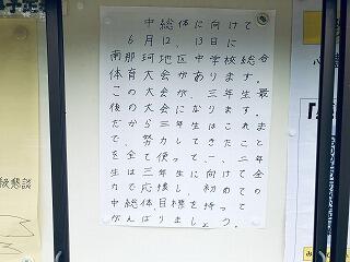 いよいよ今週の土曜日から地区中総体が始まります。本校は男女ソフトテニス競技、陸上競技に出場します。昨日は出場する選手たちの激励式がありました。生徒会より全校生徒と全職員による応援メッセージが贈られました。頑張れ!