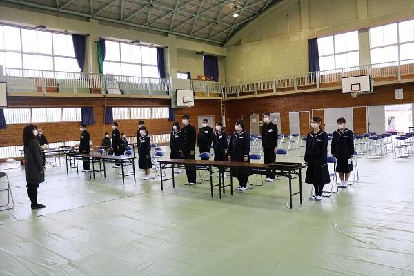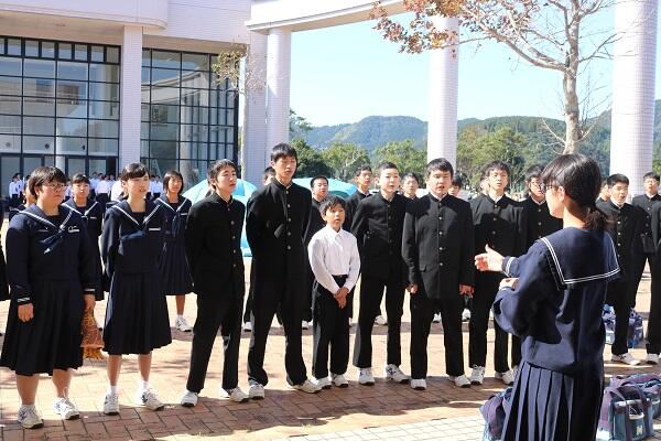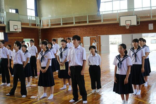 校歌斉唱で、全校生徒からの激励です。