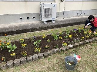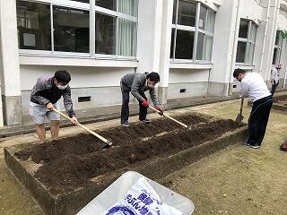 本来なら、生徒たちがする予定だった畝作りや苗植え(ピーマン・ミニトマト・ナス)を教頭先生の指導のもと、全職員でやりました。