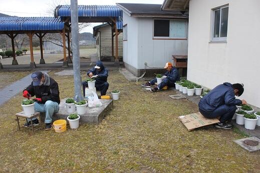 環境整備員(共立メンテナンス)の方々が卒業式の花(ペチュニア等)の準備をしていただいてます。