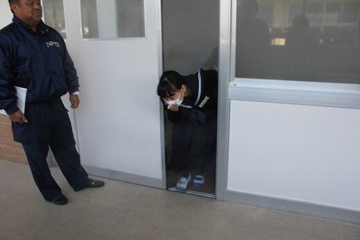 煙から逃げる訓練です。低い姿勢で逃げます。