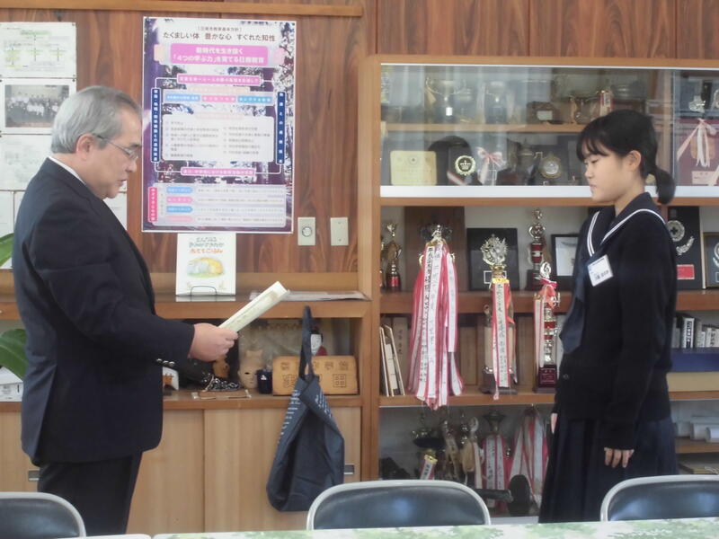 日南串間地区租税教育推進協議会会長の日南市教育委員会都甲教育長、日南税務署の中山署長、租税教室でご指導いただいた浜砂さんが本校にお見えになり、校長室で表彰式がありました。受賞者は次の4名です。