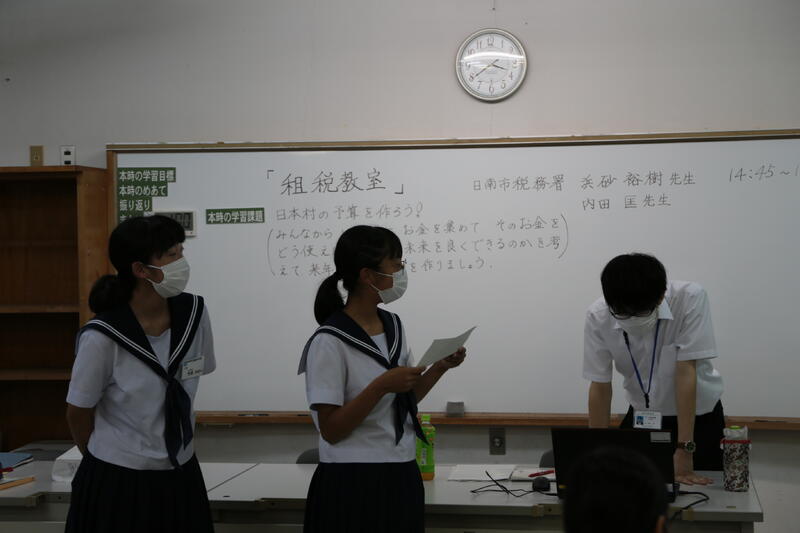 日南税務署からお二人の講師をお招きしました。税金の目的や財政の仕組みのお話を受けた後、架空の自治体「日本村」の予算編成に挑戦しました。予算を削減したり、増加させたりするとき、根拠を話し合うことで、納税の意味や財政と暮らしの関係などの気付きがあったようです。全班が自分たちの考えを発表できました。伝える態度、聞く態度、認め合う態度が素晴らしかったです。生徒代表守山さんの最後の挨拶は、講義のお礼はもちろん、納税者としての知識や意識の高まりなど、学びの深まりが伝わるものでした。