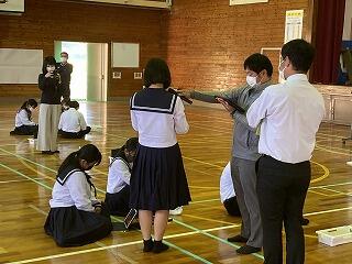 本日、2校時に地震を想定した避難訓練を実施しました。今回は、生徒がそれぞれ学校内の様々な場所から避難をする訓練でした。はじめに体育館に集合し、トイレや学級、グランドなどグループごとに割り当てられたその場所についてどんな危険があるのかタブレットを使って確認し、発表しました。その後、実際にそれぞれ割り当てられた場所から放送を聞いて避難しました。より現実的な訓練になりました。