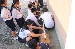 2年生が総合的な学習の時間に、「生きる」ことをテーマに火起こし体験授業を実施しました。器具はこの日のために学級担任が自作し、火種作りに挑戦しました。