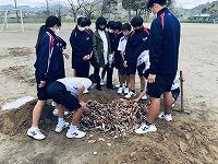 1年生が美術の授業で土器を作りました。穴を掘る、土器を運ぶ、藁を敷く、枝を敷く。枯れ葉を敷く、火を付ける(教員)など教頭先生の力を借りながら、それぞれ役割分担を決めて行いました。なかなか火の加減が難しく、かなり割れてしまいましたが、ある生徒が「縄文人は何回も失敗しながら土器を作ったのかな」とつぶやいたとき、この授業は、土器はできなくても大成功だったのかなと思いました。
