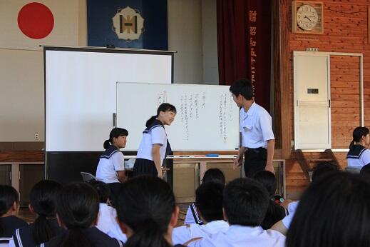 認知症のおばあさんに扮した推進員の方に、対応する生徒