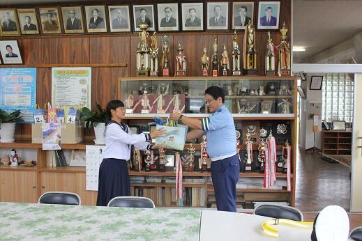 榎木田警部補から生徒会長に反射タスキが授与されました。
