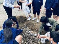 1年生が美術の授業で土器を作りました。穴を掘る、土器を運ぶ、藁を敷く、枝を敷く。枯れ葉を敷く、火を付ける(教員)など教頭先生の力を借りながら、それぞれ役割分担を決めて行いました。なかなか火の加減が難しく、かなり割れてしまいましたが、ある生徒が「縄文人は何回も失敗しながら土器を作ったのかな」とつぶやいたとき、この授業は、土器はできなくても大成功だったのかなと思いました。