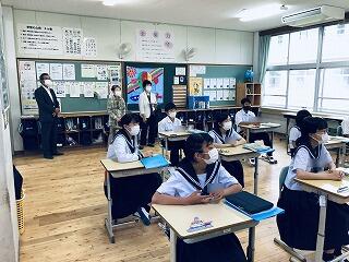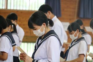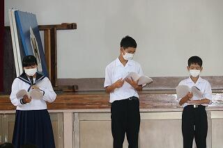 今週は人権・いじめを考える週間です。朝自習時や帰りの会、学活などをとおして、いじめや差別に関する資料を読んだり、感想を言い合ったりしています。そして昨日は、人権集会を行いました。3人の生徒が人権に関する絵本を読んだり、金子みすゞさんの詩を全校生徒で朗読したりしました。温かい思いやりに満ちた生徒になってほしいものです。