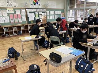 今日は、図書司書の多田先生による吾田東小6年生との本校2年生とのビブリオバトル(本の紹介合戦)について説明がありました。今回は両校をオンラインでつなぎ、中学生の3名のバトラー(紹介者)のチャンプ本を小学生が決めるようでした。2月24日に開催。とても楽しみです。