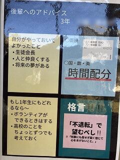 学年の廊下には、3年生が入試(私立・県立推薦)を終えての後輩へのメッセージや先月行われた1年生の「13歳のハローワーク」のまとめなどが掲示されています。また、今日も校門では委員会活動やボランティアの生徒たちが朝のあいさつ運動を頑張っていました。