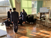 9日に火災を想定した避難訓練がありました。家庭科室からの出火を想定して児童生徒は速やかに避難しました。連絡、通報、児童生徒の避難誘導、初期消火等職員は役割を意識し活動しました。皆が避難場所の運動場まで避難する際、1分55秒ほどかかりました。その後、代表の児童生徒による消火器を使った消火訓練を行いました。そして美術室に移動して全員が煙体験をしました。煙体験では、周りが何も見えなくなり、出口まで行くのが大変であることを実感しました。