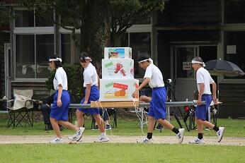中学部は鵜戸の特産物の入った箱を皆で心を一つにして運びました。