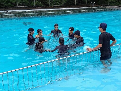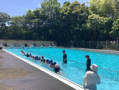 晴天の下、小学部のプール開きが行われました。プールまで、皆で1列になって歩いていきました。諸注意など話を聞いた後、水温27度のプールに入りました。水慣れをして、1~6年まで全員で貨物列車をして大盛り上がりでした。途中から1~3年生、4~6年生に分かれて水慣れや泳ぎの練習をしました。水がきれいで気持ちよさそうでしたが、子どもたちは少し寒かったと話していました。