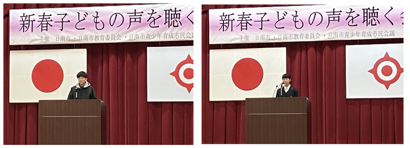 1月18日(木)に、日南市保健福祉総合センターで、市内の全小・中学校の代表が参加して自分の意見発表を行う「新春子どもの声を聴く会」が開催されました。本校からは6年生の髙野陽太郎さんが「ぼくの未来予想図」という題で、そして、7年生の中原咲和さんが「自分らしく生きる」という題でそれぞれ発表しました。他の発表者や来賓、学校関係者、保護者など大勢の人の前でしたが、臆することなく自分の考えを立派に発表することができました。