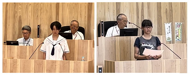 8月4日(金)に市内の小・中学校の代表児童生徒が市長や教育長に質問を行う「未来へつなぐ子ども議会」が市議会議場で行われました。本校からは、新坂夢莉さん(6年)、濵田ひよりさん(9年)が参加しました。新坂さんは「旧鵜戸小を公園にできないか?」、濵田さんは「国道220号線の整備状況はどうか?」と質問し、それに対して髙橋市長や都甲教育長が答弁してくださいました。2人とも本物の議場の壇上で堂々と質問することができました。