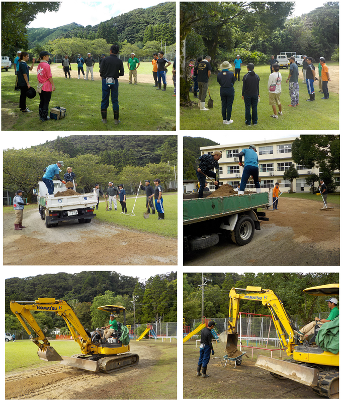 当日は炎天下の中、約2時間グランドの土の運搬やならしなど、懸命に精を出していただきました。また、今回は浜田建設様からも、真砂土の準備、配水管の整備、作業機械を含めたご支援・ご協力をいただきました。