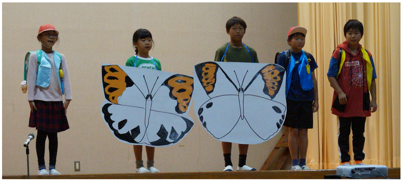 3・4年生は「ギョボク大切隊」ということで、ツマベニチョウの成長について調べたことを劇にして、一人一人が役になりきって発表することができました。