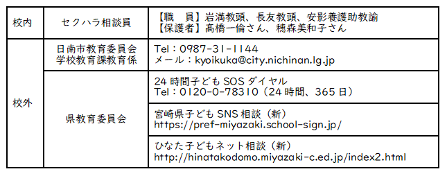 学校では、教職員等による児童生徒性暴力等の根絶を目指して取り組んでおります。もしもの場合、早期発見・早期対応できるように、左のような通報及び相談窓口を設置しておりますので、お知らせいたします。