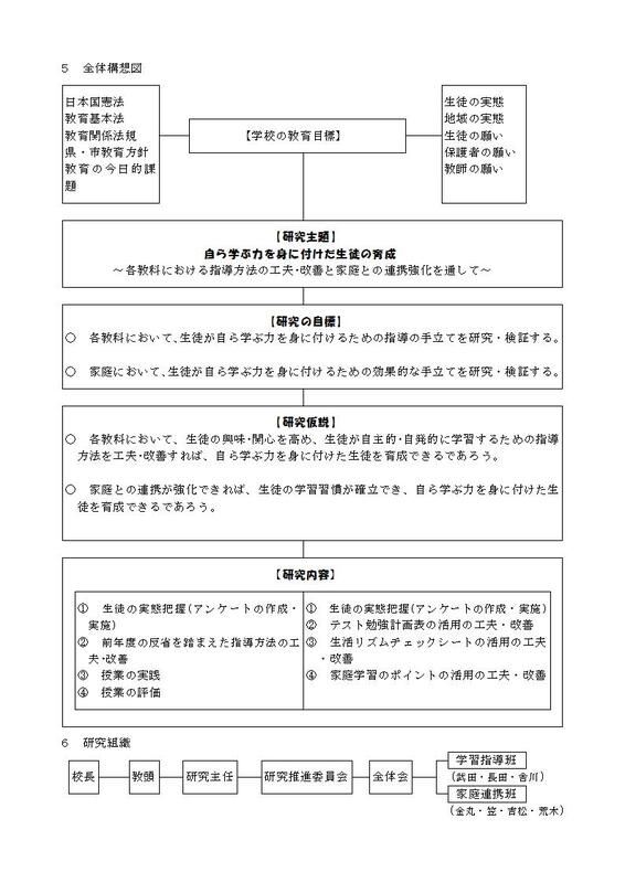 主題については昨年度に引き続き「自ら学ぶ力を身に付けた生徒の育成」として副題を~各教科における指導方法の工夫・改善と家庭との連携強化を通して~としました。主題については研究2年目になりますので、昨年度の研究を今年度はそれぞれの教科において実践しながら子どもたちの力をつけていこうと考えています。研究の概要は以下の通りです。