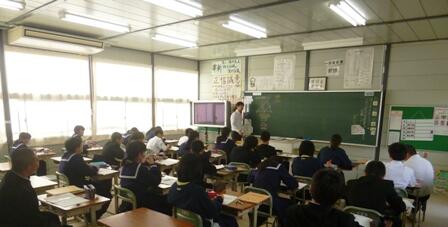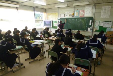 一番奥(西)にある2年校舎の1階には、2の2と2の3の教室があります。写真は2の3の数学の授業の様子です。