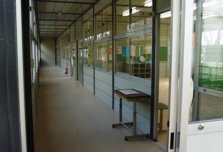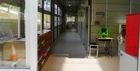 2年校舎の隣(手前)にあるのが、管理棟です。校舎の西側(奥の方)に入り口があります。写真は、入口から見た様子です。入って右手には(写真では見えませんが)階段があります。手前から、トイレ、事務室、校長室と並んで、一番奥が保健室です。