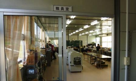 職員室は管理棟の2階にあります。写真は、階段を上って職員室の入り口から中を見たところです。