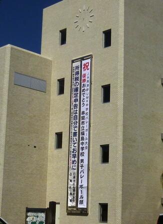 先日お伝えした、JA共済杯UMK中学校バレーボール大会における、本校男子バレーボール部の優勝を祝して、市役所に懸垂幕が設置されました。