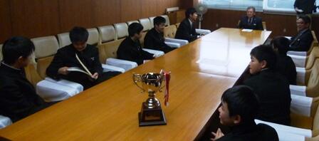 先日のJA共済杯UMK中学校バレーボール大会で優勝した、男子バレーボール部が市長を表敬訪問しました。この大会での本校の優勝は19年ぶりということで、市役所では懸垂幕を飾ってお祝いしていただいています。