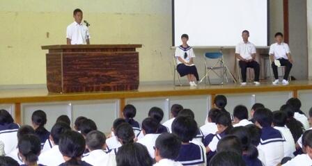 代表で、1年の立本さん、2年の山口君、3年の黒木君、生徒会執行部から内山田君の4人が、それぞれ2学期に向けっての抱負を述べてくれました。