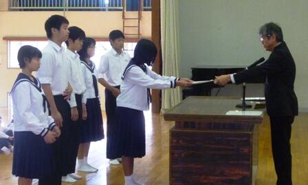 学習・文化・生活・整備・保体・給食・図書の7つの委員会の委員長・副委員長の14名が、生徒会長から任命書が授与され、そのあと、それぞれ自己紹介をしました。