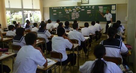 8/1(月)~3(水)の3日間、福島高校でサマースクールが実施され、本校の3年生も参加しました。これは、福島高校を会場として、串間市内6つの中学校の3年生が集まり、一緒に勉強する行事です。6つの学校の生徒をミックスして4つのクラスに分け、授業が行われます。授業内容は、受験を意識したものから、高校の体験授業や座談会、部活動の見学なども行われます。3日目には、学習塾の先生にいる授業も計画されています。写真は本校の小川教諭による社会科の授業の様子です。