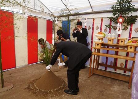 本日は、市役所・学校・工事の関係者が出席し、新武道場の建設予定地にて、起工式及び安全祈願祭が行われました。写真は、安全祈願祭の「地鎮の儀」の様子。鎌を入れられているのは土肥教育長先生です。