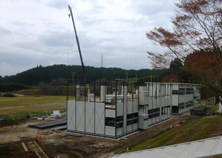 写真は、奥が教室棟、手前が管理棟になります。教室棟は外側がほぼ形になり、これから内装の工事になります。