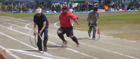 PTA団技です。輪っかまわしには、皆さん手こずってました。
