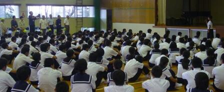 次に、生徒を代表して瀬尾君の激励の言葉と、全校生徒による応援で、体育館は盛り上がりました。
