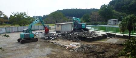 昨日から、プール横の付属棟(トイレ等)と部室の取り壊しが始まり、本日午後2時の段階で、写真のような状態になっています。
