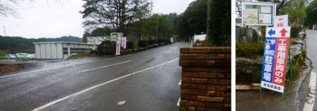 正門をくぐって、直進はできません。看板(写真右)があります。直進できるのは工事車両のみです。