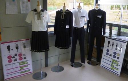 平成29年度に開校する串間中学校の制服が決定したということが先日の新聞に載っていましたが、現在、福島中の職員室前にその制服を展示しています。生徒(特に女子生徒)が、興味深そうに眺めています。