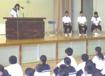 始業式では、代表で4名の生徒が、2学期に向けての抱負を述べてくれました。「行事を頑張りたい」「勉強を頑張りたい」「地域から愛される学校にしたい」「信頼される人となりたい」…等、それぞれに想いのこもった発表をしてくれました。