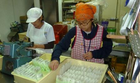 「玉味製菓」では、この日、お菓子の袋詰めを頑張ってました。