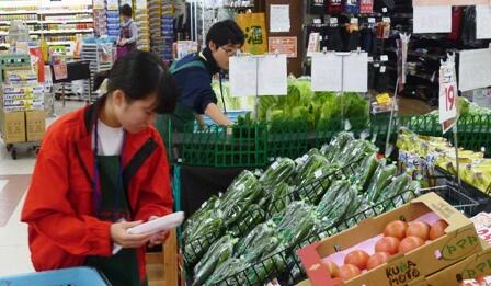 「ニシムタ」の野菜売り場で、商品を並べる生徒たち。がんばってます!