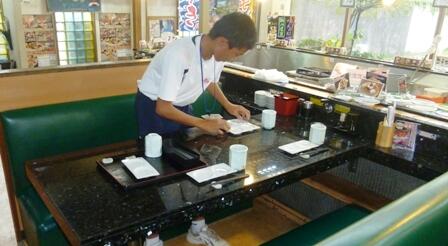「寿司虎」で、テーブルをセットする生徒。寿司を握る練習もさせていただいたようです。