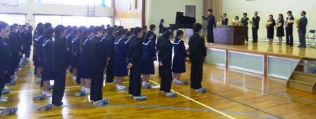 式では、校長が離任者の紹介をした後、お一人お一人からお言葉をいただきました(写真上)、次に代表で2年生の中山さんが、先生方一人一人に感謝の言葉を述べました。(写真中)最後に、集まってくれた卒業生を含め全員で校歌を歌いました。(写真下)