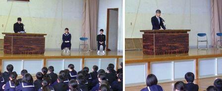 最初に、代表で1年生の浅野君、2年生の山下さんに修了証を渡したあと、代表で1年生の脇本さん、2年生の立本君、生徒会執行部から武田君がこの1年を振り返って発表をしてくれました。