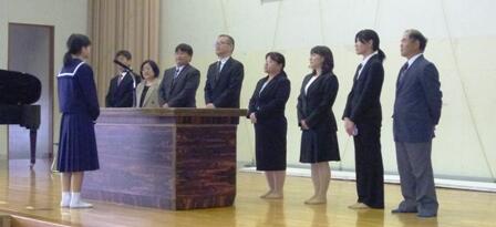 式では、校長が離任者の紹介をした後、お一人お一人からお言葉をいただきました(写真上)、次に代表で2年生の中山さんが、先生方一人一人に感謝の言葉を述べました。(写真中)最後に、集まってくれた卒業生を含め全員で校歌を歌いました。(写真下)