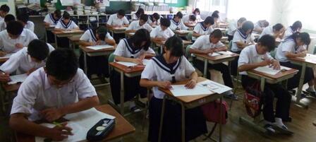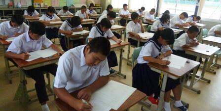写真は上から、1年の数学のテスト、2年の国語のテスト、3年の理科のテストの様子です。