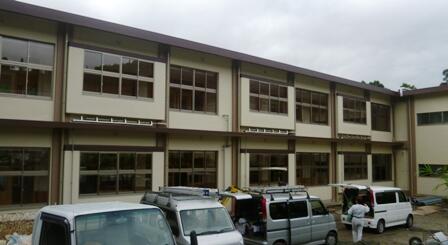 校舎改修工事が進んでいます。部分によってはまだまだの箇所もありますが、2・3年生が入る予定の新しい教室棟はほぼ完成が近づいたので、今の時点での様子を見せていただきました。写真で紹介します。上から、外観、教室の正面、後方、窓側、廊下側と廊下にある手洗い場です。